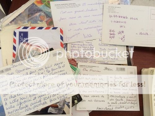 | Những lá thư du khách nhiều nơi gửi lại ông Ngộ. Ảnh: Mỹ Phượng |