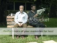 Father and son are sitting on a bench. Suddenly a sparrow lands across them.